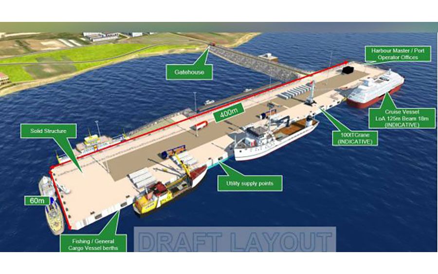La maqueta de la futura terminal portuaria con sus 400 metros de atraque que serán esenciales para el desarrollo comercial y económico de las Islas. El Gobierno de las Islas Falkland, FIG, anunció la firma de varios contratos que serán un mojón en la entrega de la nueva terminal portuaria para las Islas Falkland, un proyecto fundamental que significara el reemplazo de la vieja y obsoleta estructura actual, conocida como FIPASS, y por tanto desempeñará un papel vital para el futuro económico de las Falklands.