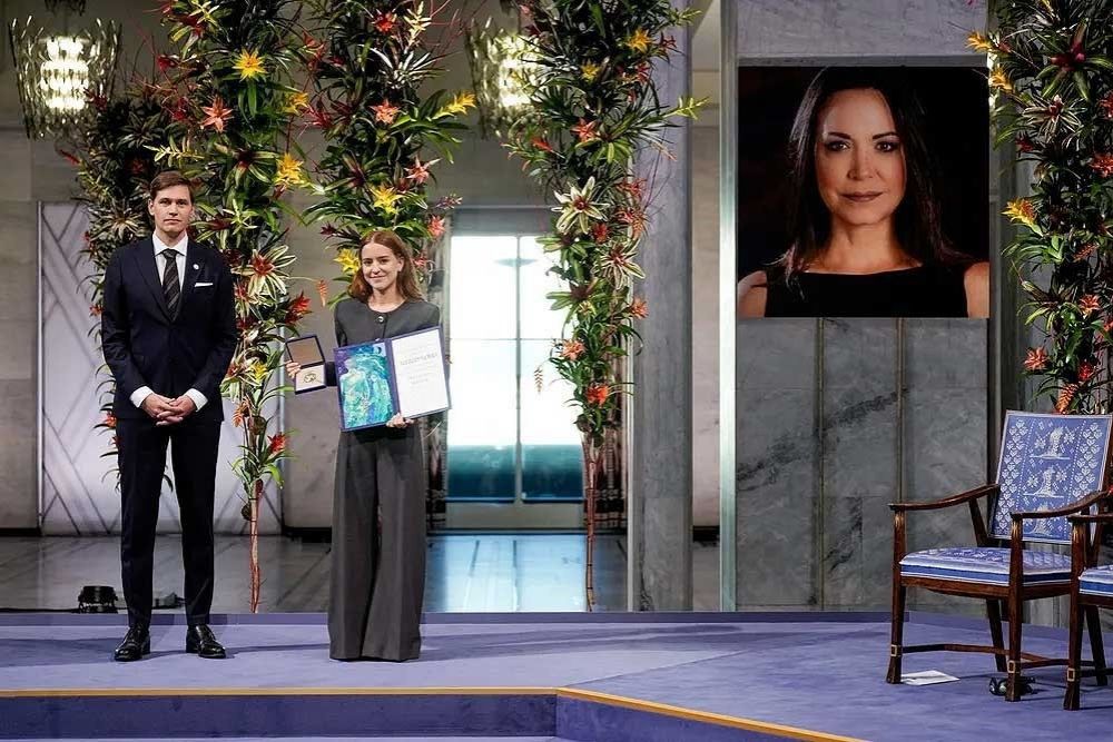 Ana Corina Sosa Machado leyó el mensaje, dado que la galardonada no pudo asistir a la ceremonia debido a lo que el Comité del Nobel describió como el gran peligro que rodeaba su viaje.