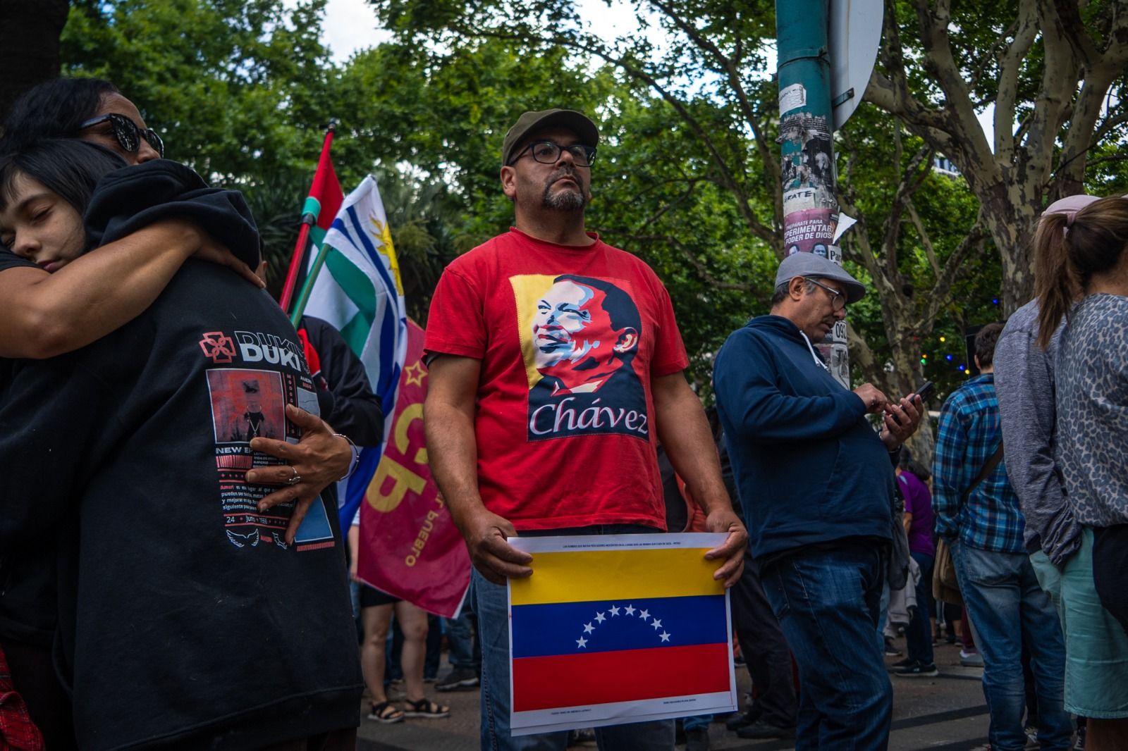 Manifestantes uruguayos de izquierda protestan contra la invasión estadounidense en Venezuela. Foto: Sebastián Astorga Los gobiernos de Brasil, Chile, Colombia, México, Uruguay y España emitieron un comunicado conjunto este domingo, expresando su profunda preocupación y rechazo a la operación militar estadounidense que resultó en la captura de Nicolás Maduro.