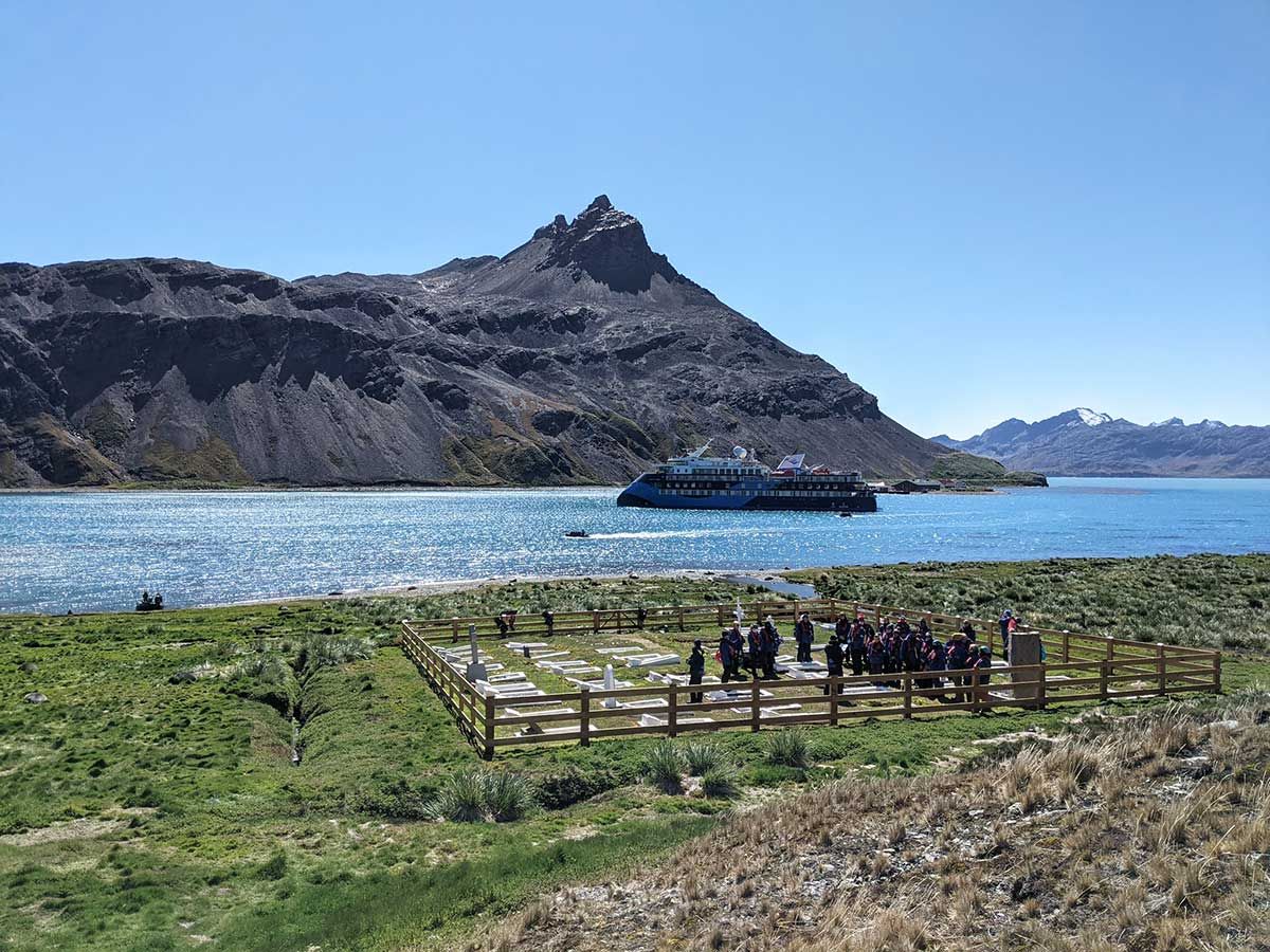 Un crucero expedición de los tantos que esperan esta temporada, y en primer plano visitantes a la tumba del explorador Sir Ernest Shackleton El 17 de enero es el Día de la Posesión para la isla de Georgia del Sur, ubicada en la región sub-Antártica del Atlántico y que ahora conforma un Territorio Británico de Ultramar junto a las Islas volcánicas Sándwich del Sur. La fecha recuerda cuando el afamado explorador inglés James Cook pisó tierra por primera vez en la isla y reclamó el territorio en nombre y honor del Rey Jorge III.