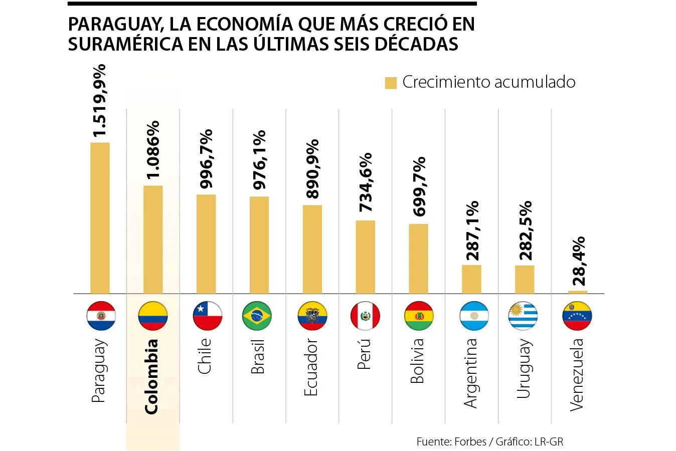 La comparación regional sitúa a Paraguay por detrás a economías más grandes: Colombia, Chile y Brasil exhiben fuertes expansiones de largo plazo, pero inferiores en términos porcentuales Entre 1960 y 2024, Paraguay registró el mayor crecimiento acumulado del PIB en Sudamérica, según cálculos difundidos por Forbes Paraguay y el diario La República a partir de series del Banco Mundial en dólares constantes de 2015. En ese lapso, la economía pasó de alrededor de US$ 2,8 mil millones a unos US$ 46 mil millones (base 2015), un salto de más de 16 veces.
