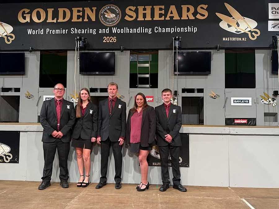 El equipo, Adam Dickson, Pilar Castro, Gerente del grupo Richard Short, Talia Jones and Evan Jones (Foto FB) Esquiladores de las Islas Falkland, tanto mujeres como hombres han tenido un desempeño tan destacado como meritorio en la competencia de Tijeras Doradas, que se está desarrollando esta semana, hasta el sábado, en la localidad de Masterton, Nueva Zelanda.